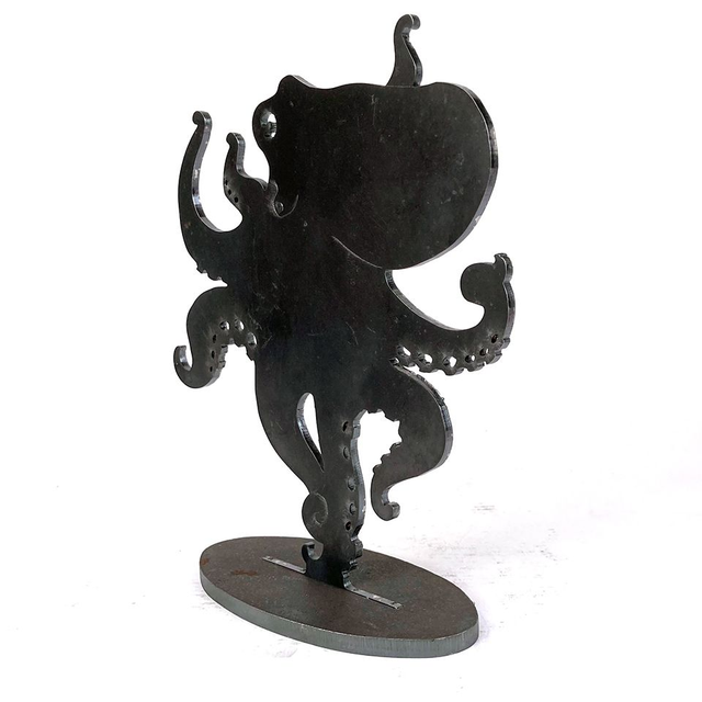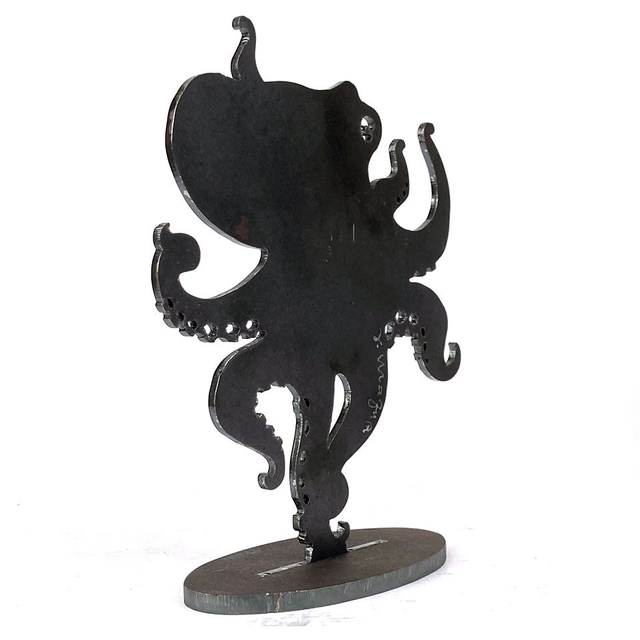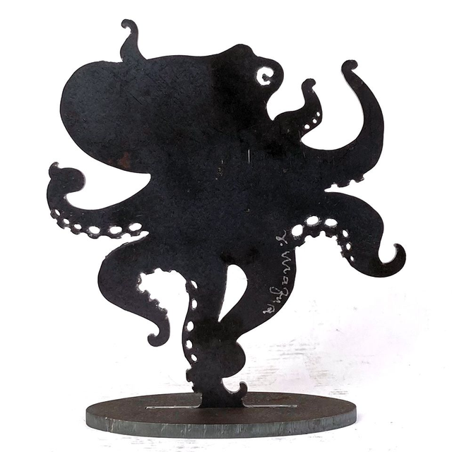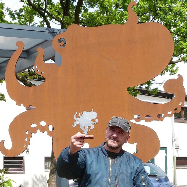 Diese kleine Krakenskulptur ist zunächst als zeichnerischer Entwurf für ein Maskottchen für meinen ehemaligen Tauchsportverein, dem TSA Oberhausen entstanden. Seit 2018 steht sie in einer vergrößerten Version und ebenfalls aus einer Stahlplatte herausgeschnitten vor dem Vereinsheim, das sich auf der Rückseite des Stadion Niederrhein befindet. Mit Blick auf den Rhein-Herne Kanal, thront sie dort auf-einem Findling im Innenhof.