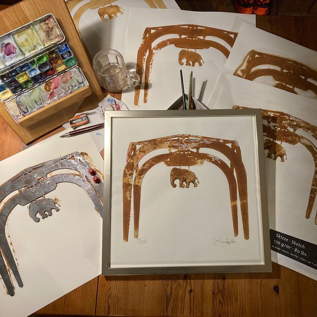 Je nach Vollständigkeit der Rostabdrucke, koloriere ich mit einer angesetzten Rosttinktur und mit Aquarellfarben die hell-dunkel Modulation der Skulptur und der Stahlkonstruktion nach. Die Drucke sind handsigniert und mit dem Entstehungsjahr versehen.