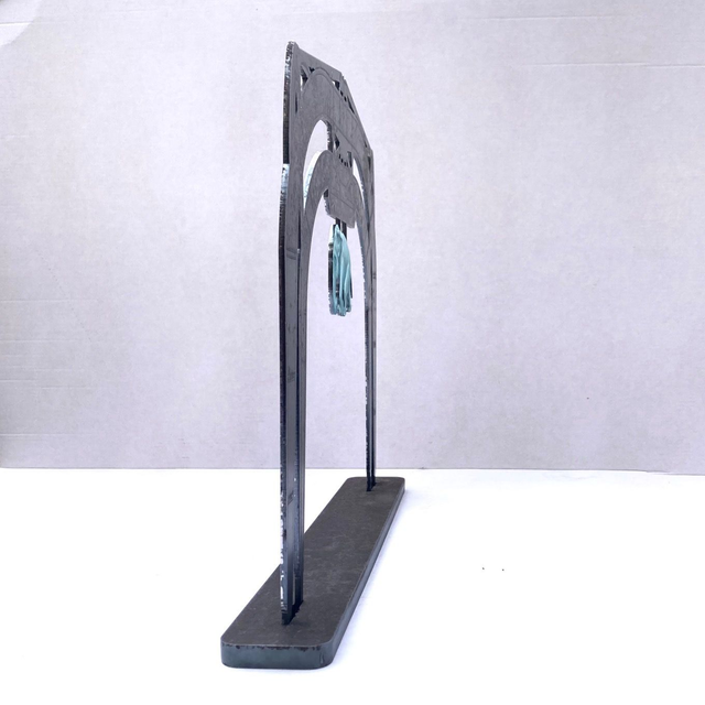 Bei Lieferung ist die Skulptur in ihre Elemente Sockel und Stahlbogen zerlegt. Die Unterseite des Sockels ist als solche beschriftet, was den Aufbau vereinfacht.
